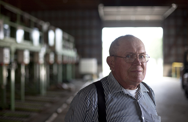 John Froese poses for a portrait in front of the cucumber grading machine on his farm in Vienna, Ont. (June 12, 2012)